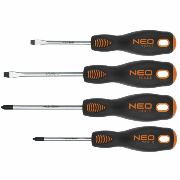 A Neo csavarhúzó szett 4 csavarhúzóból áll: lapos és kereszt csavarhúzókból. A csavarhúzó szára kivételesen ellenálló króm-vanádium acélból készül. A csavarhúzó hegy hőkezelésnek lett alávetve, így megfelelő, 56 HRC keménységet és hajlítószilárdságot ért el. A csavarhúzó hegye mágneses. A markolat három élű hasáb alakja a kialakított hüvelyktámasszal