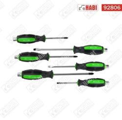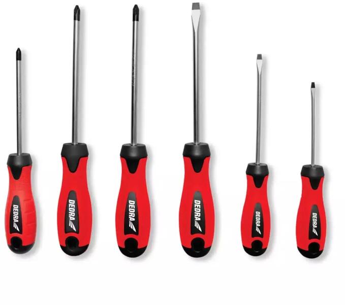 6 csavarhúzóból álló készlet, amely nemcsak a professzionális műhelyben, hanem otthon is használható. A csavarhúzók króm-vanádium acélból (CrV) készültek, amely biztosítja a szükséges keménységet és tartósságot. A kényelmes fogantyú dupla TPR anyagból készült, amely biztonságos fogást biztosít a felhasználónak. Ezenkívül a csavarhúzók mágneses hegyekkel van