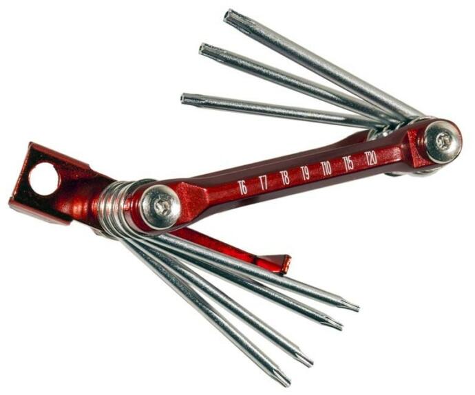 Termékadatok: Összecsukható (bicska) lyukas külső torx kulcs készlet Méret: T-6, 7, 8, 9, 10, 15, 20 Szár hossza: 50 mm Hosszúság: 85 mm Szélesség: 34 mm Magasság: 15 mm Anyag: Króm-vanádium acél A szerszámacélok legfontosabb tulajdonságai a keménység és a kopásállóság A vanádium tovább növeli a keménységet és a kifáradással szembeni ellenállást A króm az acél
