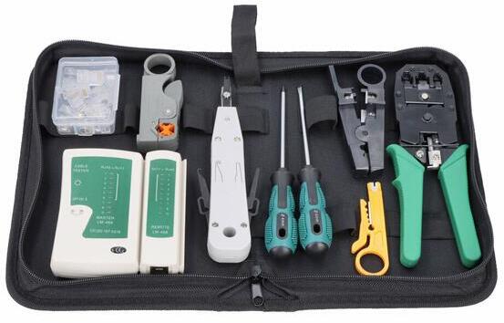Hálózati LAN kábel szerelő készlet 10-darabos (kábeltesztelő, vágófogó, csavarhúzó-fogó krimpelő)