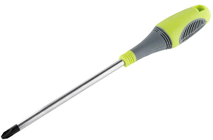 FELO PH csavarhúzó, különösen nagy igénybevételre tervezett, kétkomponensű markolattal. Alkalmazása: Philips típusú - általában lemez- és gipszkarton csavarokhoz. Méretei: PH0, penge hossza: 60 mm, penge átmérője: 3,0 mm, markolat hossza: 80 mm, markolat legnagyobb átmérője: 25 mm. Penge Anyaga: króm-molibdén-vanádium acél ötvözet. Felületkezelés: krómozott, a hegy b