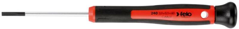 FELO lapos, műszerész csavarhúzó hornyos csavarokhoz, kétkomponensű csúszásmentes markolattal. A markolat végén elhelyezkedő szabadon forgó sapkának köszönhetően a súrlódás minimálisra csökken. A markolatban található furat segítségével könnyen tárolható a szerszám és egy másik FELO csavarhúzó segítségével extra nyomaték érhető el. Méretei: hegy szélesség