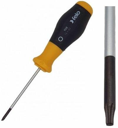 FELO csavarhúzó Torx csavarokhoz, ERGONIC markolattal. Az egyetlen markolat, melynek a belsejében lévő zselés cella alkalmazkodik a felhasználó tenyeréhez, a maximális nyomaték kifejtése mellett, egyedülállóan kényelmessé teszi a munkavégzést. Méretei: T8, penge hossza: 60 mm, penge átmérője: 3,0 mm teljes hosszban, markolat hossza: 86 mm, markolat legnagyobb átmérője: 25