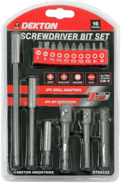 -Pozi bitek: PZ1, 2 x PZ2 és PZ3-Phillips bitek: PH1 és PH2-Egyenes bitek: 5 mm és 6 mm-Szögletes bitek: S1 és S2-Három fúró adapter-Három hosszabbító-Anyag: CR-V