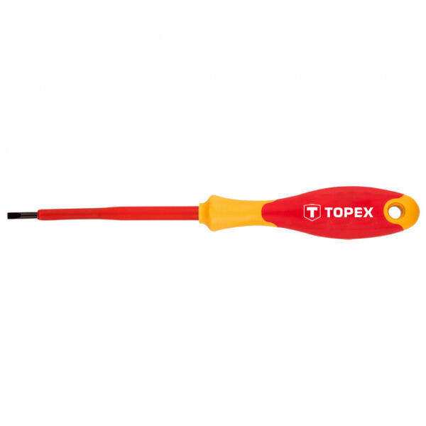 A Topex lapos csavarhúzó 1000 V a legfeljebb 1000 V feszültség melletti munkákra szolgál. Kiváló minőségű króm-molibdén acélból készül, szigetelt. Az ergonómikus, csúszásmentes anyaggal bevont műanyag markolat biztosítja a kényelmet és a biztonságot a munkavégzés során. A Topex márka ezermestereknek készül. Lapos csavarhúzó, 3X99, 1000 V, tanúsított, CrMo acél,