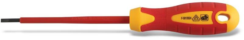 HÖGERT Csavarhúzó szigetelt 1000V, lapos, 5,5 x 125 mm, acél S2, mágneses (HT1S905) Termék információ: Ház anyaga: S2 acél Méret: 5,5 x 125 mm Feszültség alatt történő munkálatokhoz engedélyeztetett 1000V lapos csavarhúzó Erőteljes csavarozáshoz alkalmas Két oldalt polírozott csavarozó fejek, összetartó és párhuzamos profilozással A EN 60900 szabvány szerint gyártot