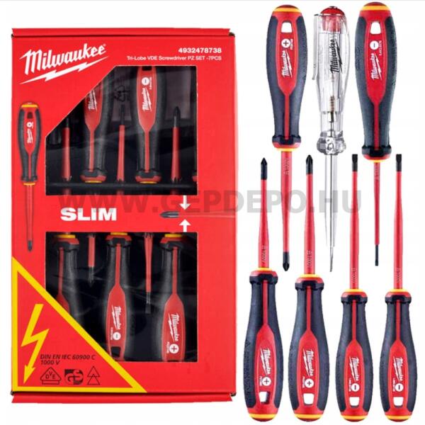 Milwaukee szigetelt csavarhúzó készlet Tri-Lobe markolattal - 7 részes (PH, PZ, SL) SL2.5 / SL3 / SL4, PH2, PZ1 / PZ2 és feszültségmérő VDE tesztelve 10 000 V-nál, 1000 V-ra hitelesítve. A keskeny átmérő lehetővé teszi a nehezen elérhető helyeken lévő csavarokhoz történő hozzáférést is. Háromoldalú kényelmes markolat a nagyobb nyomaték érdekében. A jól látható je
