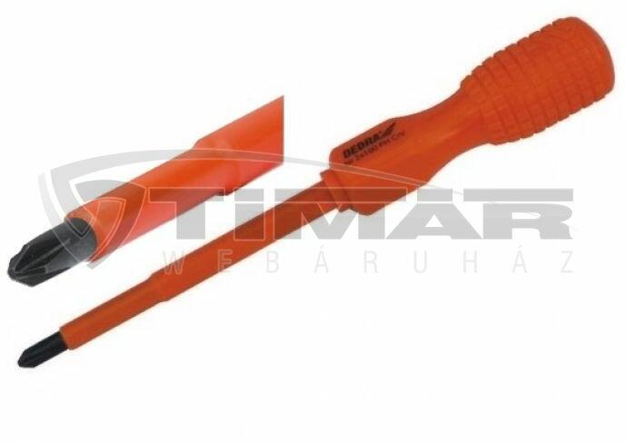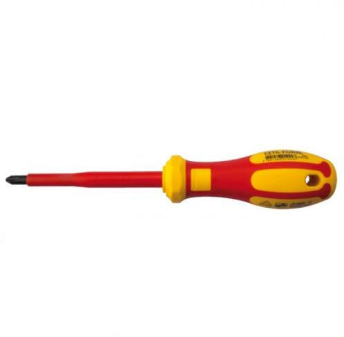 Neo PH kereszt csavarhúzó, 1000 V. A szerszám max. 1000 V feszültség alatti használatra minősített. A csavarhúzó hegye erős S2 acélból készül. A csavarhúzó hegye mágneses. A speciális gallérral ellátott nyél ergonómikus alakja csökkenti a kéz terhelését munka közben. A bimateriál markolat nem csúszik ki a kézből, ellenálló vegyszerek, kenőolajok és zsírok hatá
