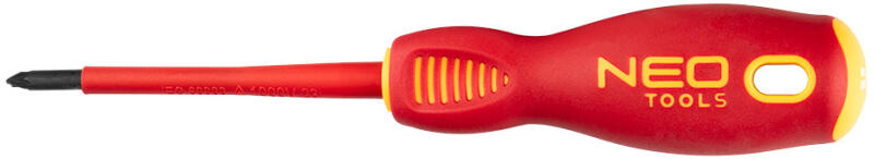 Neo 1000 V kereszt csavarhúzó. A szerszám max. 1000 V feszültség alatti használatra minősített. A csavarhúzó szára kivételesen ellenálló SVCM acélból készül. A csavarhúzó hegy hőkezelésnek lett alávetve, így megfelelő, 56 HRC keménységet és hajlítószilárdságot ért el. A csavarhúzó hegye mágneses. A markolat három élű hasáb alakja a kialakított hüvelyktáma