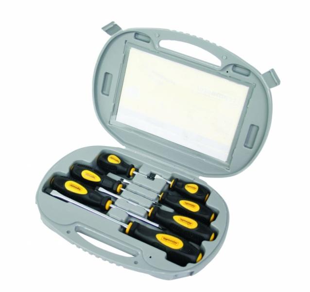 7 db-os készlet műanyag tartóban Cr-V acél, mágneses hegy és két komponensű fogantyú 3 db Phillips: PH2x38mm, PH1x75mm, PH2x100mm 4 db lapos: 6x38, 4x75, 6x100, 8x150 mm