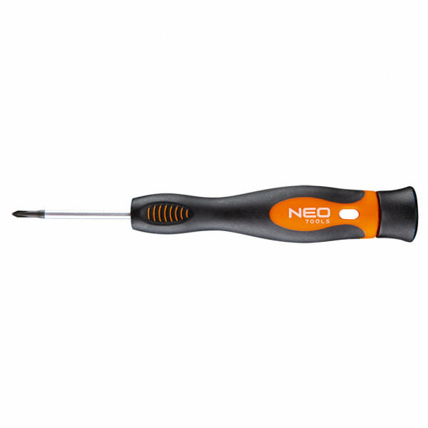 Neo precíziós Phillips csavarhúzó PH (ref. 04-116), méretei PH0 x 50 mm. A csavarhúzó penge extra erős S2 acélból készült. A csavarhúzó munkahegyét hőkezelték, aminek köszönhetően megfelelő keménységet és hajlításállóságot értek el. A csavarhúzó mágneses hegyű. A nyélben lévő forgó foglalat lehetővé teszi a csavarok pontos meghúzását. A két anyagból ké