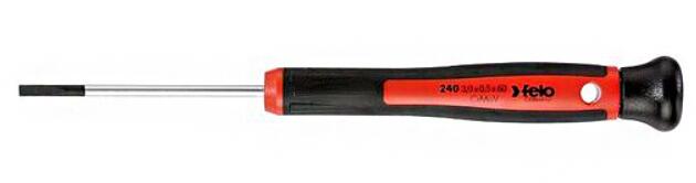 FELO lapos, műszerész csavarhúzó hornyos csavarokhoz, kétkomponensű csúszásmentes markolattal. A markolat végén elhelyezkedő szabadon forgó sapkának köszönhetően a súrlódás minimálisra csökken. A markolatban található furat segítségével könnyen tárolható a szerszám és egy másik FELO csavarhúzó segítségével extra nyomaték érhető el. Méretei: hegy szélesség