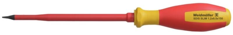 WEIDMÜLLER SDIS SLIM 1.2X6.5X150 VDE szerint szigetelt csavarhúzó hornyos pengével 1,2x6,5x150, SlimLine (2749640000) Term ékinformáció: VDE-szig etelésű csavarhúzó készletek, max. 1000 V AC és 1500 V DC feszültség alatt álló alkatrészekhez, DIN EN 60900. IEC 900. Minden darab „GS Safety bevizsgálással. A vágókés edzett, magas minőségű króm-vanádium-molibdén acélbó
