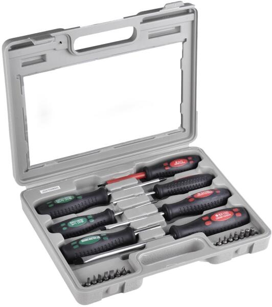 Csavarhúzó készlet, 21 részes Műszaki adatok: Alkalmazás: Műhely · Anyag: Króm-vanádium acél · Csavarhúzó típus: Csavarhúzó készlet · Elhajtás: Egyeneshornyú, Kereszthornyú Pozidriv Szállítás tartalma: Egyenespengéjű csavarhúzók:: 8 x 150/6 x 100/4 x 75/3 x 75 mm, Kereszthornyú csavarhúzók: PZ 1/2, Markolat bit tartóval, Bitek: egenes pengéjű 3/4/4,5/5/6 mm keres