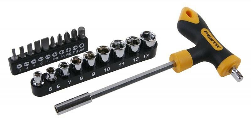 A termék leírása: T csavarhúzó bitekkel - bitek 1/4 "* 25 mm és fej 1/4", CrV mágneses szárvég bitekhez, négyzet alakú 1/4 "fejekhez biztonsági labdával ergonomikus kétkomponensű fogantyú Készlet tartalma: lapos bitek 3, 4, 5, 6, 8 és PH 0, 1, 2, 3 és adapter hatszög 1/4 " négyzet 1/4" 5. , 6. , 7. , 8. , 9. , 10. , 11. , 12. , 13. fej