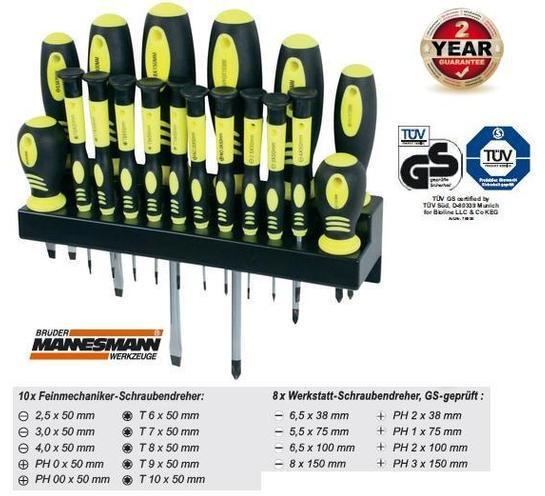 JELLEMZŐK: 2 év garancia TÜV/GS certifikációval Minőségi termék a 80 éves legendás német MANNESMANN WERKEZEUGE-től. TÜV/GS króm-vanádium bevizsgált profi csavarhúzókészlet műhelybe, 18 részes, falraszerelhető tartójával. Minőségi CV stahl acélból készült, többrétegű fogók mágneses heggyel. Tipusok: Egyenes pengéjű/PH/TORX 10db műszerész csavarhúzó: 2,5/3,0/