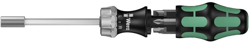 Racsnis csavarhúzó, Kompakt 27 RA 1 Kompakt szerszám többkomponensű Kraftform markolattal a nagyobb munkasebesség és különösen ergonomikus csavarozáshoz. Beépített bittartó racsnival a markolatban: finom fogazással a kis visszaugrási fok érdekében, átkapcsoló gyűrű (jobb, rögzítés, bal), max. forgatónyomaték 50 Nm-ig Hatlapú penge 1/4"-os belső kulcsnyílású felfogá