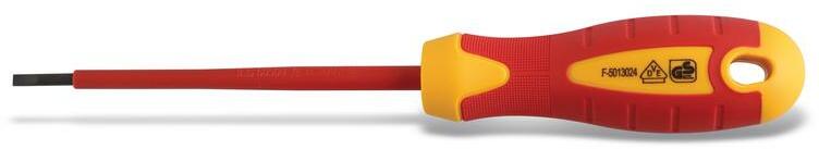 HÖGERT Csavarhúzó szigetelt 1000V, lapos, 3 x 100 mm, acél S2, mágneses (HT1S903) Termék információ: Ház anyaga: S2 acél Méret: 3 x 100 mm Feszültség alatt történő munkálatokhoz engedélyeztetett 1000V lapos csavarhúzó Erőteljes csavarozáshoz alkalmas Két oldalt polírozott csavarozó fejek, összetartó és párhuzamos profilozással A EN 60900 szabvány szerint gyártott VD