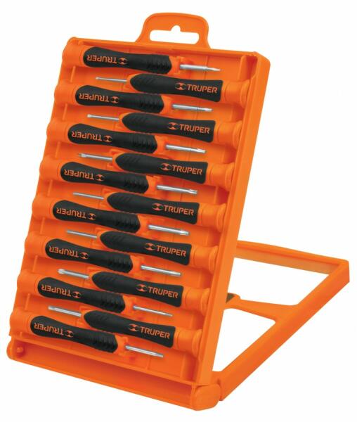 - Precíziós megmunkálású króm-vanádium-acélból készült csavarhúzószárak - Ergonomikus polipropilén és TPR fogantyúk a kényelem érdekében - Forgó fej - Rendezői tok, amely megkönnyíti a tárolást A csomag tartalmaz: - 3 db Phillips tip csavarhúzó: # 00, # 0 és # 1 - 3 lapos csavarhúzó: 1,4 mm, 1,8 mm és 2,4 mm - 3 csavarbehajtó csavarhúzó: 1,5 mm, 2 mm és 2,5 mm -