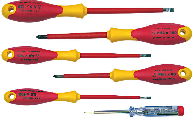 Keménység 58 ± 2 HRC A csavarhúzó hegye króm-vanádium-molibdén ötvözetű acélból készült, ami garantálja az ellenállóságot a becsorbulás és a megcsavarodás ellen. A fogantyúja magas minõségű anyagokból készült (ABS és természetes gumi) Műanyag dobozba csomagolva Tartalmaz: - lapos csavarhúzók: 3x100, 4x100, 5.5x125 mm; - csillagcsavarhúzók: (PH): 1x80, 2x100 mm;