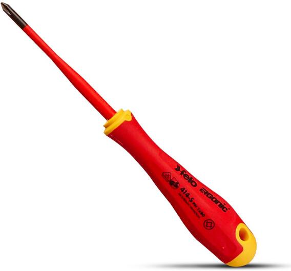 FELO PH szigetelt csavarhúzó, ERGONIC markolattal. Az egyetlen markolat, melynek a belsejében lévő zselés cella alkalmazkodik a felhasználó tenyeréhez, a maximális nyomaték kifejtése mellett, egyedülállóan kényelmessé teszi a munkavégzést. A csavarhúzó 1000 voltig használható. Minden darab 10.000 volttal tesztelt, megfelel az EN60900 szabványnak. Alkalmazása: Philips típu