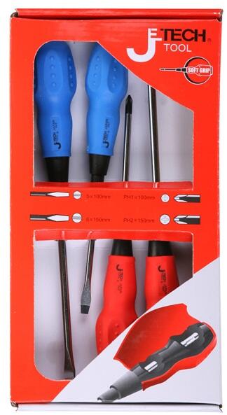 A készlet tartalma: 2 db lapos csavarhúzó formatervezett nyéllel: ST5-100 (hegyméret: 5 mm; munkahossz: 100 mm) ST6-150 (hegyméret: 6 mm; munkahossz: 150 mm) 2 db Phillips® csavarhúzó formatervezett nyéllel: ST5-100 (hegyméret: PH1; munkahossz: 100 mm) ST6-150 (hegyméret: PH2; munkahossz: 150 mm)
