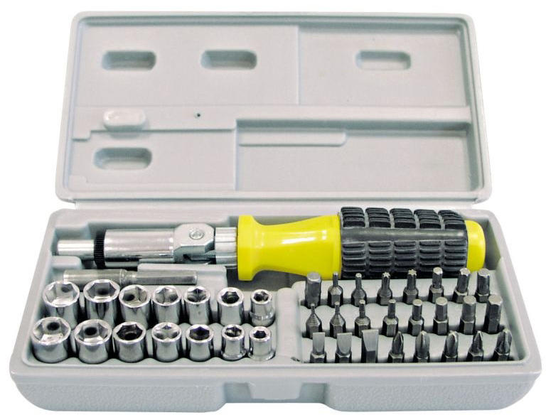 A készlet tartalma: 1/4 adapter markolat 1/4 50 mm-es hosszabbító szár 1/4 dugókulcs 6, 7, 8, 9, 10, 11, 12 mm, 3/16, 1/4, 5/16, 11/32, 3/8 7/16, 1/2 1/4 Pozidriv bitfejek: PZ1, PZ2 PH1, PH2, PH3 1/4 Négyszög bitfejek: SL5, SL6, SL7 SL5, SL6, SL7, SQ1, SQ2, SQ3 1/4 Torx bitfejek: T10, T15, T20, T25, T27, T30, T40 1/4 Imbusz bitfejek: H1.5, H2, H2.5, H3, H4, H5, H5.5, H6 Műanyag tartóban,
