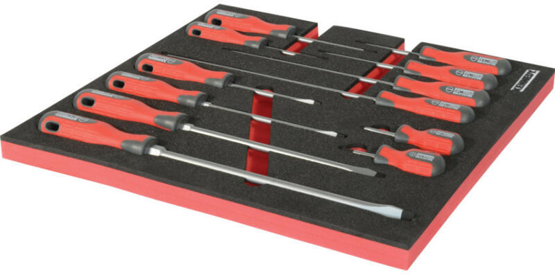Speciális króm-vanádium acélból készült penge mágneses éllel. Egyedülálló, háromszög keresztmetszetű, két komponensű erős markolat. A beépített puha zónák megkönnyítik a nyomaték átvitelét. Tárolást könnyítő akasztó lyukkal a markolat végén. 12 darabos készlet összetétele: Kereszthornyos: No. 2 x marok, No. 1 x 75, No. 2 x 100, No. 3 x 150. Pozidriv: No. 2 x 1
