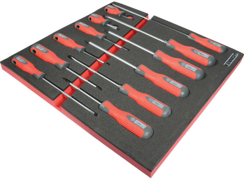 Speciális króm-vanádium acélból készült penge mágneses éllel. Egyedülálló, háromszög keresztmetszetű, két komponensű erős markolat. A beépített puha zónák megkönnyítik a nyomaték átvitelét. Tárolást könnyítő akasztó lyukkal a markolat végén. 12 darabos készlet összetétele: Kereszthornyos: No. 2 x marok, No. 1 x 75, No. 2 x 100, No. 3 x 150. Pozidriv: No. 2 x 1