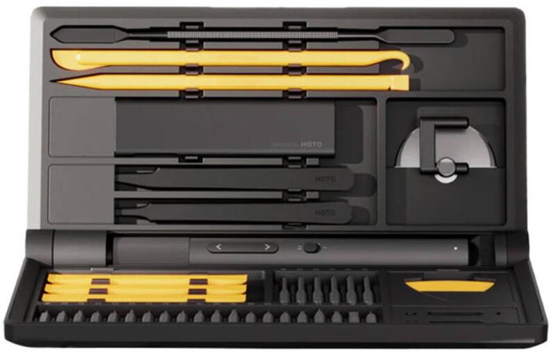 Electric precision screwdriver HOTO QWLSD012 electronics repair kit The HOTO QWLSD012 kit will come in handy for minor repairs to your laptop, smartphone, watch, camera, etc. In the package you will find a precision screwdriver and various types of bits, magnetic pad, tweezers, undermining tools, etc. On the other hand, the dedicated case allows you to store all the items in one place and keep the