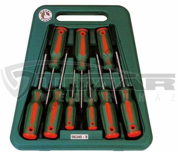 HANS TORX Csavarhúzó készlet furatos 9 részes TH8-TH40 06450-9TH az iSzerszámnál. Professzionális, ipari minőségű (Industrial) HANS furatos TORX csavarhúzó készlet. A 9 részes készlet tartalma 1-1 db csavarhúzó: TH8; TH9; TH10; TH15; TH20; TH25; TH27; TH30 és TH40 méretben. Anyaga Króm-vanádium. Ergonomikus kialakítású, kémiailag semleges, kétkomponensű markolat a bizton