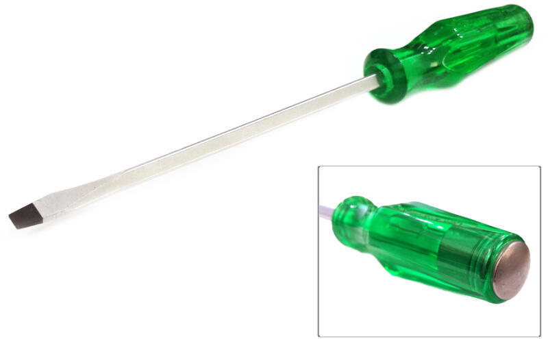 Ampro Üthető markolatú hosszú lapos csavarhúzó, ergonomikusan kialakított műanyag markolattal Tulajdonságok: - Szár anyaga: Chrome-Vanádium acél - Markolat anyaga: Műanyag - Fej rész: Fekete foszfát bevonattal képezve - Szár kialakítása: négyzetes Hosszúság: 150 mm Fej mérete: 6 mm Markolat mérete: 93 mm