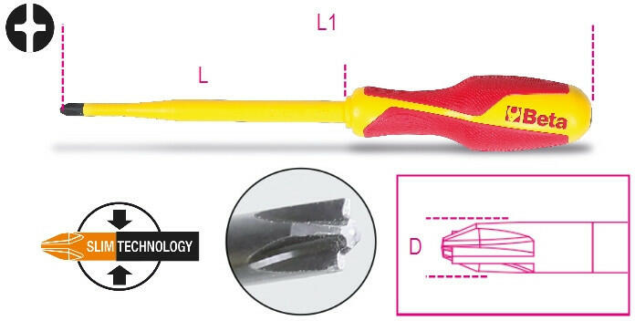 Beta 1275MQ/C, kombinált csavarhúzó PH kereszthornyos + egyenes hornyú csavarokhoz, PH1+LPP Beta által gyártott szigetelt szerszámok tervezésénél az elektromossággal kapcsolatos előírásokat tartották szem előtt. Minden szigetelt szerszám lehetővé teszi a munkát feszültség alatti berendezéseken: váltóáramnál 1000 V alatti , egyenáram esetén 1500 V alatti feszültségig.