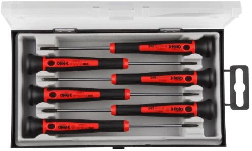 FELO műszerész csavarhúzó készlet, kétkomponensű csúszásmentes markolattal. A markolat végén elhelyezkedő szabadon forgó sapkának köszönhetően a súrlódás minimálisra csökken. A markolatban található furat segítségével könnyen tárolható a szerszám és egy másik FELO csavarhúzó segítségével extra nyomaték érhető el. Tartalma: 1,5x60, 2,0x60, 2,5x60, 3,0x60, PH