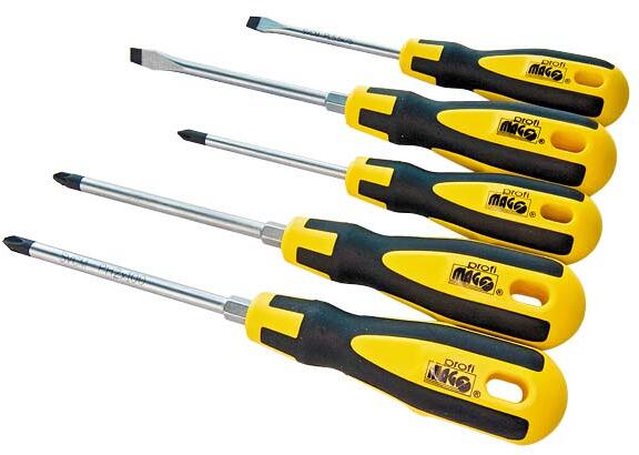 5 darab Profi csavarhúzó készlet hatszögletű szárral a csavarkulcshoz. 1x PL 5,5x75 1x PL 6,5x100 1x PH1x75 1x PH2x100 1x PZ2x100
