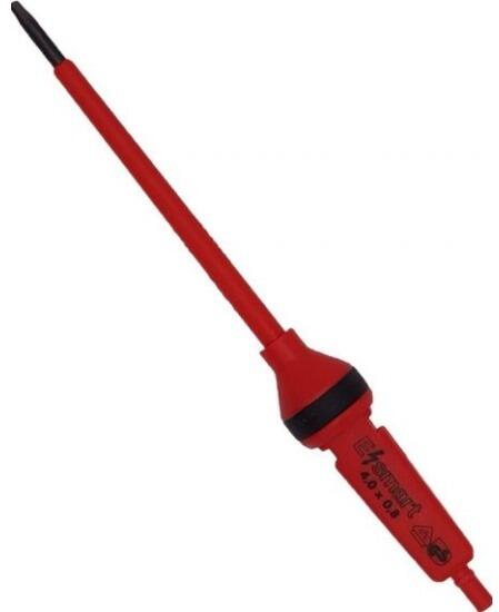 Felo FELO E-SMART szigetelt csavarhúzó penge. A kupak eltávolítása után behelyezhető az E-SMART markolatba így normál szigetelt csavarhúzóként használható. Alkalmazható: hornyos csavarokhoz. A csavarhúzó 1000 voltig használható. Minden darab 10.000 volttal tesztelt, megfelel az EN60900 szabványnak. Méretei: hegy szélessége: 4,0 mm, hegy vastagsága: 0,8 mm, penge hossza: 100