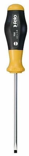 FELO lapos csavarhúzó hornyos csavarokhoz, különösen nagy igénybevételre tervezett, kétkomponensű markolattal. Méretei: hegy szélessége: 3,0 mm, hegy vastagsága: 0,5 mm, penge hossza: 75 mm, penge átmérője: 3,0 mm, markolat hossza: 80 mm, markolat legnagyobb átmérője: 25 mm. Penge Anyaga: króm-molibdén-vanádium acél ötvözet. Felületkezelés: krómozott, a hegy bevonat né