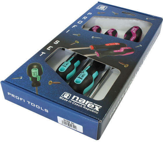 Narex S LINE PROFI csavarhúzó készlet 5 db -os 855850 A csomag tartalma: Lapos: 3.0 x 75 mm Lapos: 4.0 x 100 mm Lapos: 6.5 x 150 mm Csillag: PH1 x 80 mm Csillag: PH2 x 100 mm