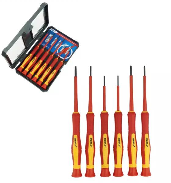 Ez a 6 darab precíziós szigetelt csavarhúzóból álló készlet elektromos munkákhoz használható szerszám. A csavarhúzó megvédi a felhasználót az áramütéstől 1000 V-ig. A szigetelt penge S2 acélból készült. A csúszásmentes felülettel ellátott ergonomikus markolat biztos fogást biztosít és garantálja a precíz munkavégzést. VDE 1000V tanúsítvánnyal rendelkező csav