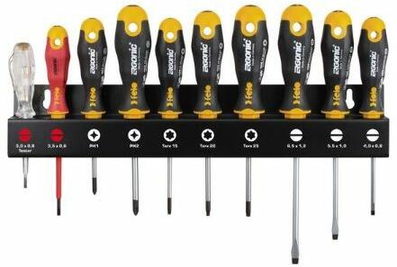 FELO Ergonic csavarhúzó készlet, műhelyben alkalmazható fém faliartóval. Tartalma: 3 db lapos, 2 db PH, 3 db Torx, 1 db lapos szigetelt, 1 db fázisceruza csavarhúzó