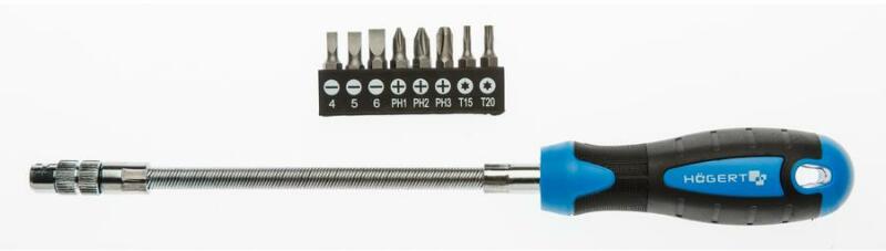 Csavarhúzó 215 mm-es hajlékony szárral és bitkészlettel: 4,5 mm-es és 6 mm-es hornyolt bitek, PH1, PH2 és PH3 bitek, valamint Torx T15 és T20 bitek. Arra tervezték, hogy a sarkok körül meghajoljon, és olyan nehezen hozzáférhető helyekre is bejusson, ahol egy hagyományos csavarhúzó nem kezelhető. termékleírása csavarhúzó 215 mm-es rugalmas szárral és bitkészlettel: 4,5 m