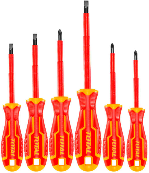 6 darabos szigetelt csavarhúzó készlet / INDUSTRIAL (THTIS566) A TOTAL THTIS566 professzionális szigetelt csavarhúzókészlet alkalmas javításokhoz, szereléshez, szétszereléshez és más olyan munkákhoz, ahol kábelekkel és elektromos alkatrészekkel dolgoznak. A készlet három kereszt és három egyenes csavarhúzót tartalmaz (60-150 mm hosszúságú), mágneses végződésekkel. A