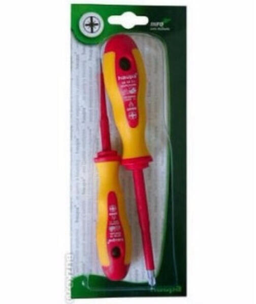 HAUPA 101879 installációs csavarhúzó klt. 2db-os (1-es +2-es) 1000V (101870+101872) Csavarhúzókészlet PZ – laposprofilú (installációs) csavarhúzókkal 2-komponensű nyéllel, PP/TPE -anyagból, a penge molibdén-vanádium-acélból, edzve, besugározva, darabonként bevizsgálva Tartalma: 101870 101872