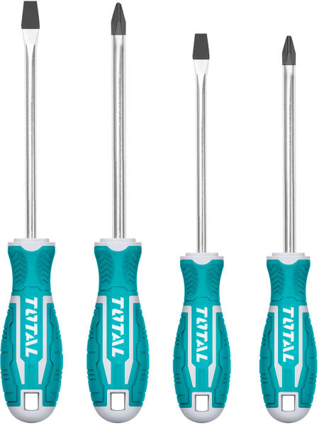 4 darabos csavarhúzó készlet CRV/ SL5.5X100mm/SL6.5X150mm/ PH1X100mm/ PH2X150mm (THT250604) Egy csavarhúzó készletet kínálunk, amely kiváló minőségű CRV anyagból készült. Az új kialakítású markolat kényelmes fogást biztosít, így könnyedén és hatékonyan dolgozhatsz vele. A készlet tartalmaz két kerek szárral rendelkező csavarhúzót és két keresztvágású csavarh