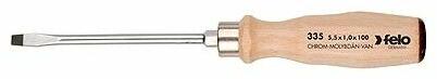 FELO lapos csavarhúzó hornyos csavarokhoz, hengeres keresztmetszetű pengével, fa markolattal. A szerszámban végigfutó acél penge lehetővé teszi a penge közvetlen ütését. A pengén lévő erősített hatszög részen villáskulcs segítségével növelhető a nyomaték. Méretei: hegy szélessége: 10,0 mm, hegy vastagsága: 1,6 mm, penge hossza: 175 mm. Penge Anyaga: króm-molibdén-
