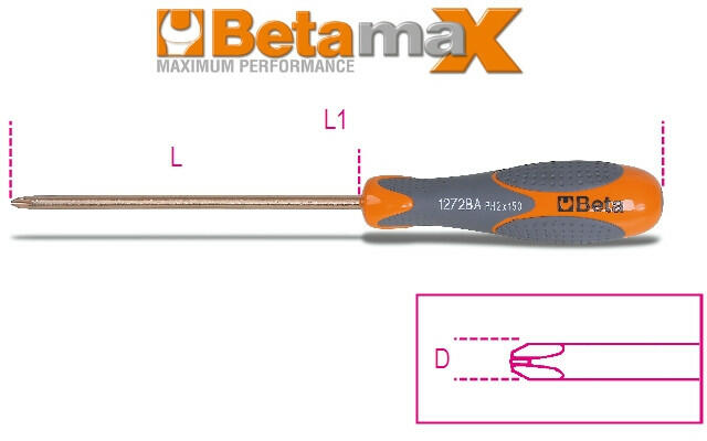 Csavarhúzó Phillips®-csavarokhoz, szikramentes Réz-berillium ötvözet (CU-BE) A Beta szikramentes szerszámokat a BAM (Szövetségi Anyagkutató és Vizsgáló Intézet) a 99/92/EC Európai Irányelvnek megfelelően tanusítja.
