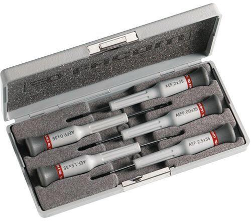 Erős és precíz meghúzásra tervezett forma három mikrotechnikai pozícióban. A megfelelő csavarhúzó egyszerű azonosítása színjelöléssel. Tokban szállítjuk.