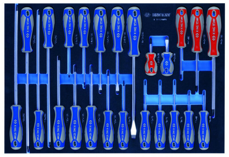 King Tony csavarhúzó készlet 24 db-os Tálcás kivitel (560x375mm) PP+TPR nyél SNCM+V ötvözött szár Tartalma: 1421 Ph: 2x38, 1x80, 2x100, 3x150; 1422 lapos: 3x75, 4x100, 5.5x100, 6.5x100, 10x200, 6.5x38; 1423 torx: T30x250, T25x250, T20x250, T15x250, T30x125, T27x100, T25x100, T20x100, T15x75, T10x75, T9x75, T8x75, T7x48, T6x48 Speciálisan a VW Csoport, Mercedes-Benz, Opel, BMW, Japán gy