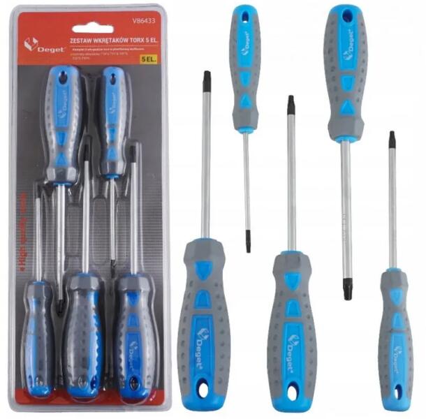 Csavarhúzó készlet króm vanádium acélból (CrV). Az ergonómikus fogantyú biztosítja a szerszám biztonságos fogását, és hatékony és pontos munkát. A készlet öt torx csavarhúzóból áll. A csavarhúzók méretét úgy választották meg, hogy megfeleljenek minden otthonban és műhelyben használt csavaroknak. A SZETT TARTALMA: Torx csavarok: T10 * 3, T15 * 3, T20 * 5, T25 * 5,