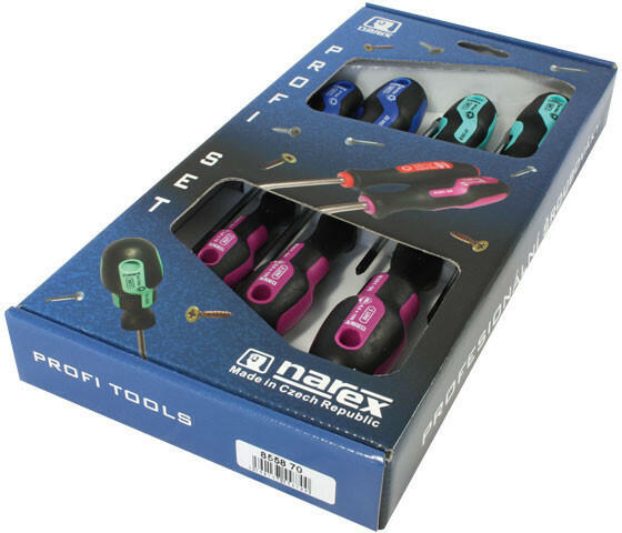 Narex S LINE PROFI csavarhúzó készlet 5 db -os 855851 A készlet tartalma: Lapos: 3.0 x 75 839101 Lapos: 4.0 x 100 839102 Lapos: 6.5 x 150 839106 Csillag: PZ1 x 80 839401 Csillag: PZ2 x 100 839402